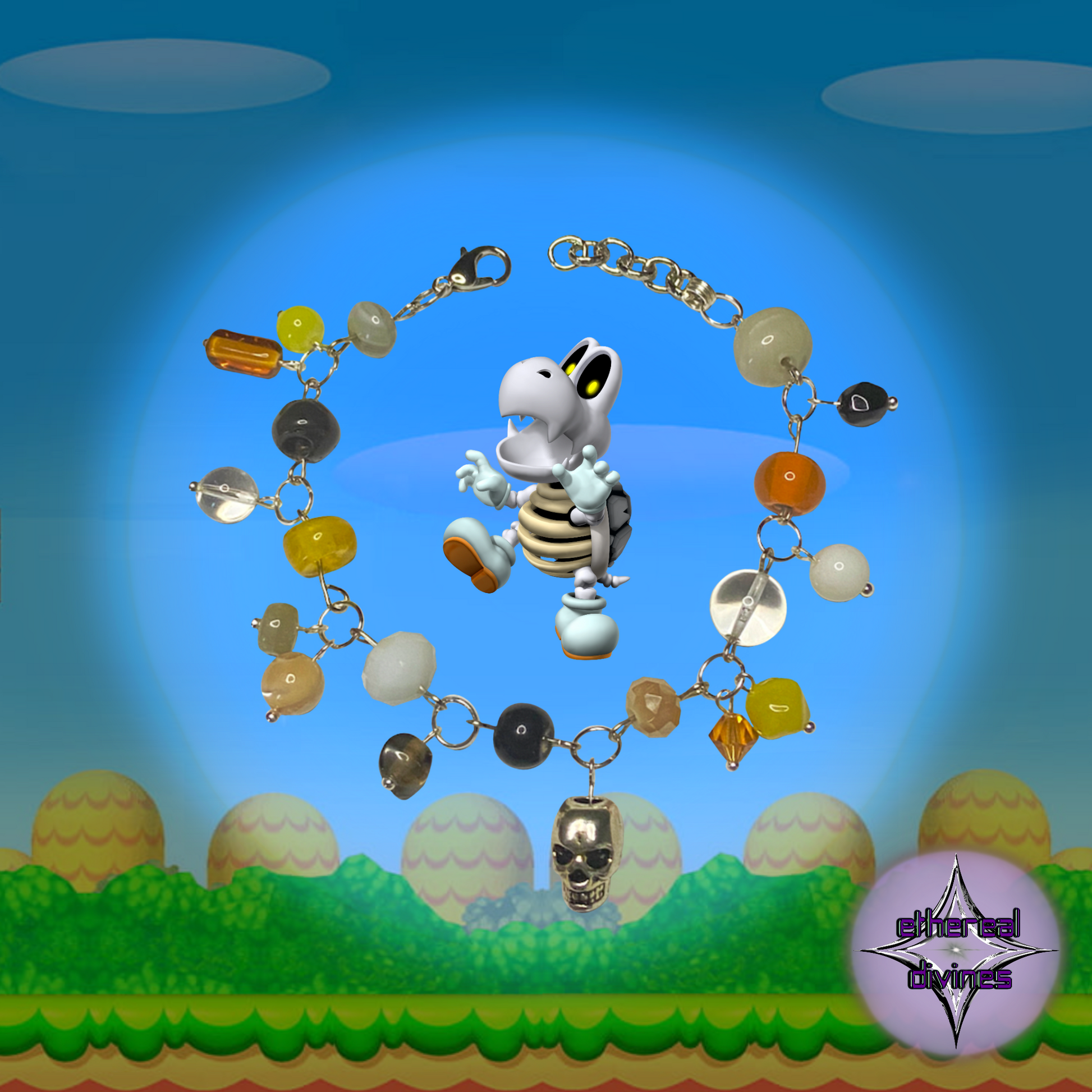 This charm bracelet is inspired by one of the most iconic and beloved video game characters, Skull Bones. Adorned with various charms, this bracelet is perfect for any fan. Made with high-quality materials, it brings a touch of nostalgia and style to any outfit. Featuring iconic grey, black, and yellow colors paired with elegant silver links, this bracelet adds a playful yet sophisticated touch to any outfit. Bring out your inner gamer with this unique and stylish piece.