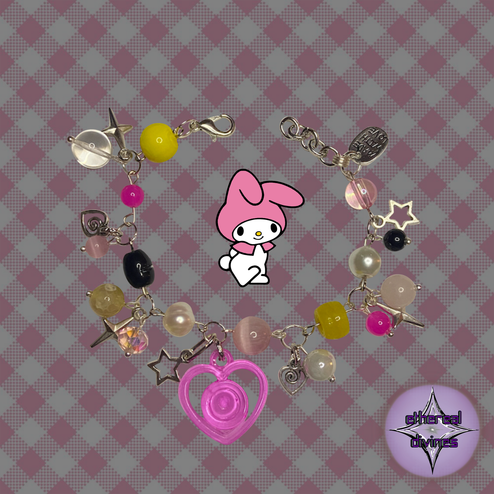 This charm bracelet is inspired by one of the most adorable and sweetest friends, My Melody. Adorned with various charms and featuring sweet and adorable designs inspired by Sanrio's beloved character! This bracelet is perfect for any individual. Made with high-quality materials, it brings a touch of sparkle and style to any outfit. Featuring iconic pink, yellow, white, and black colors paired with elegant silver links, this bracelet adds a playful yet sophisticated touch to any outfit. Embody kindness with this dazzling accessory, while perfectly adding a touch of cuteness to any outfit.