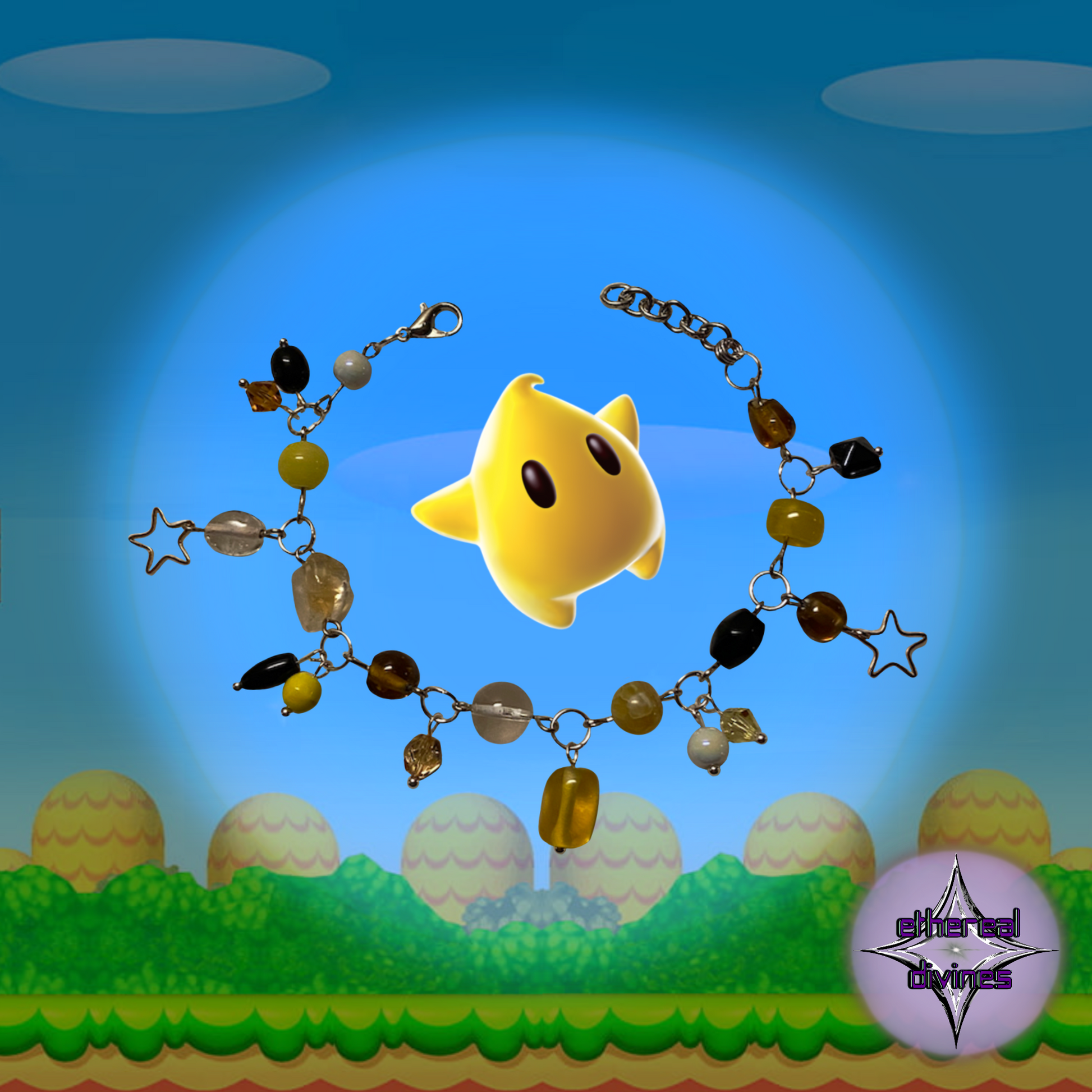 This charm bracelet is inspired by one of the most iconic and beloved video game characters, Luma. Adorned with various charms, this bracelet is perfect for any fan. Made with high-quality materials, it brings a touch of nostalgia and style to any outfit. Featuring iconic yellow, black, and gold colors paired with elegant silver links, this bracelet adds a playful yet sophisticated touch to any outfit. Bring out your inner gamer with this unique and stylish piece.